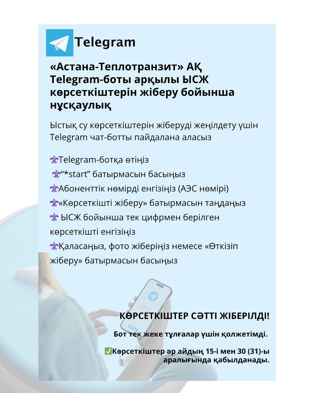 Ыстық сумен жабдықтау көрсеткіштерін беру үшін Telegram ботын пайдалану нұсқаулық